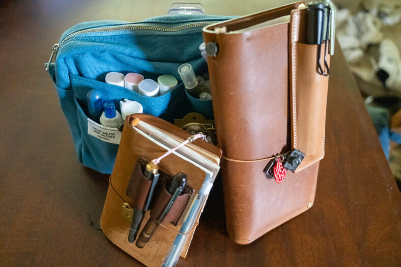 My full sized Traveler’s Notebook continues to exist in it’s same form: I’ll swap notebook inserts out for general journaling, art things, Solo RPG projects, the sticker insert, travel journal, etc. It is, low key, also a great place just to store random ephemera that I want to glue into a journal entry as well as business trip receipts.